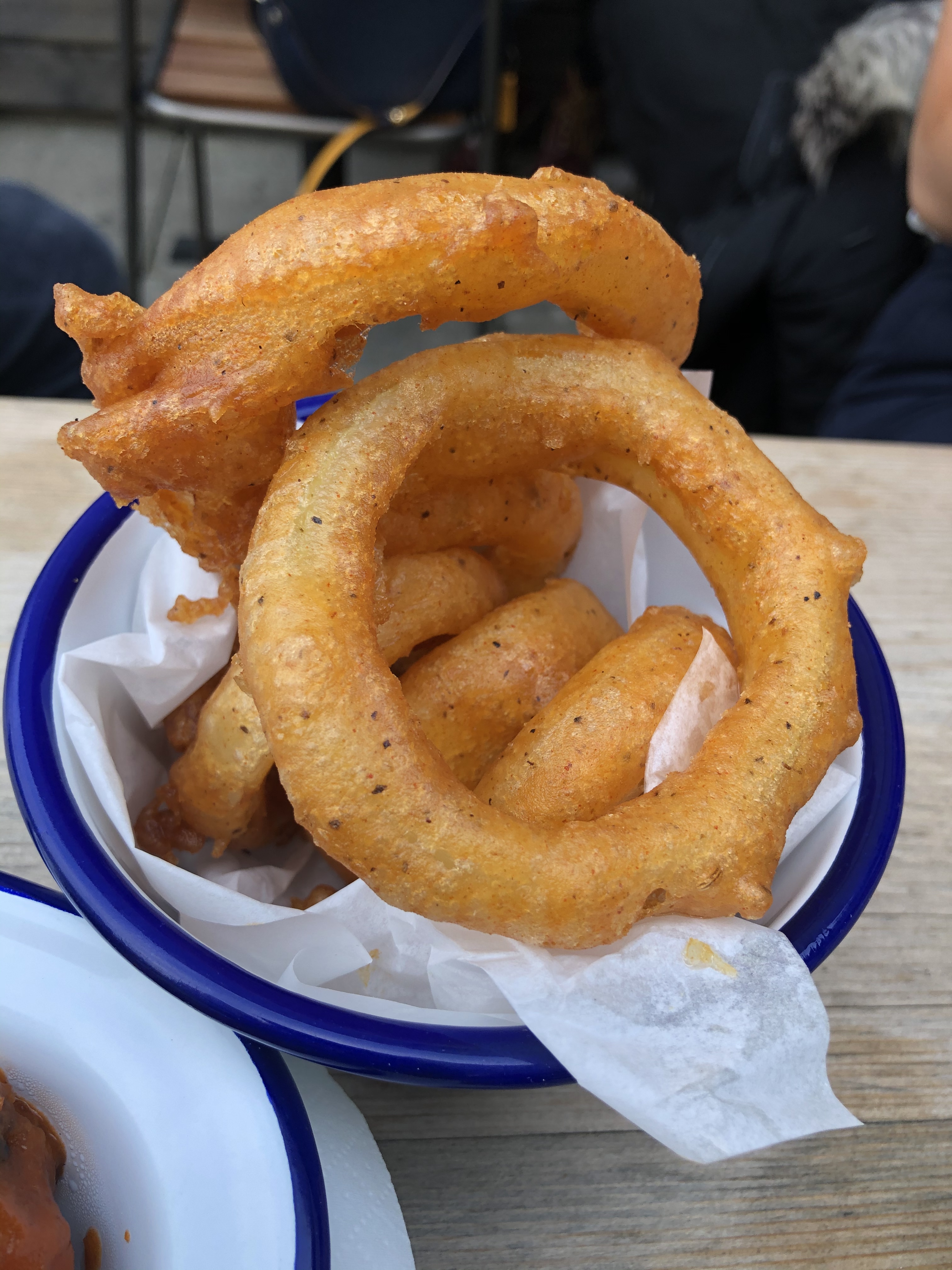 Onion rings are well cooked with a slightly sweet and spicy batter, made even better dipped into their gorgeous beef and bacon gravy.