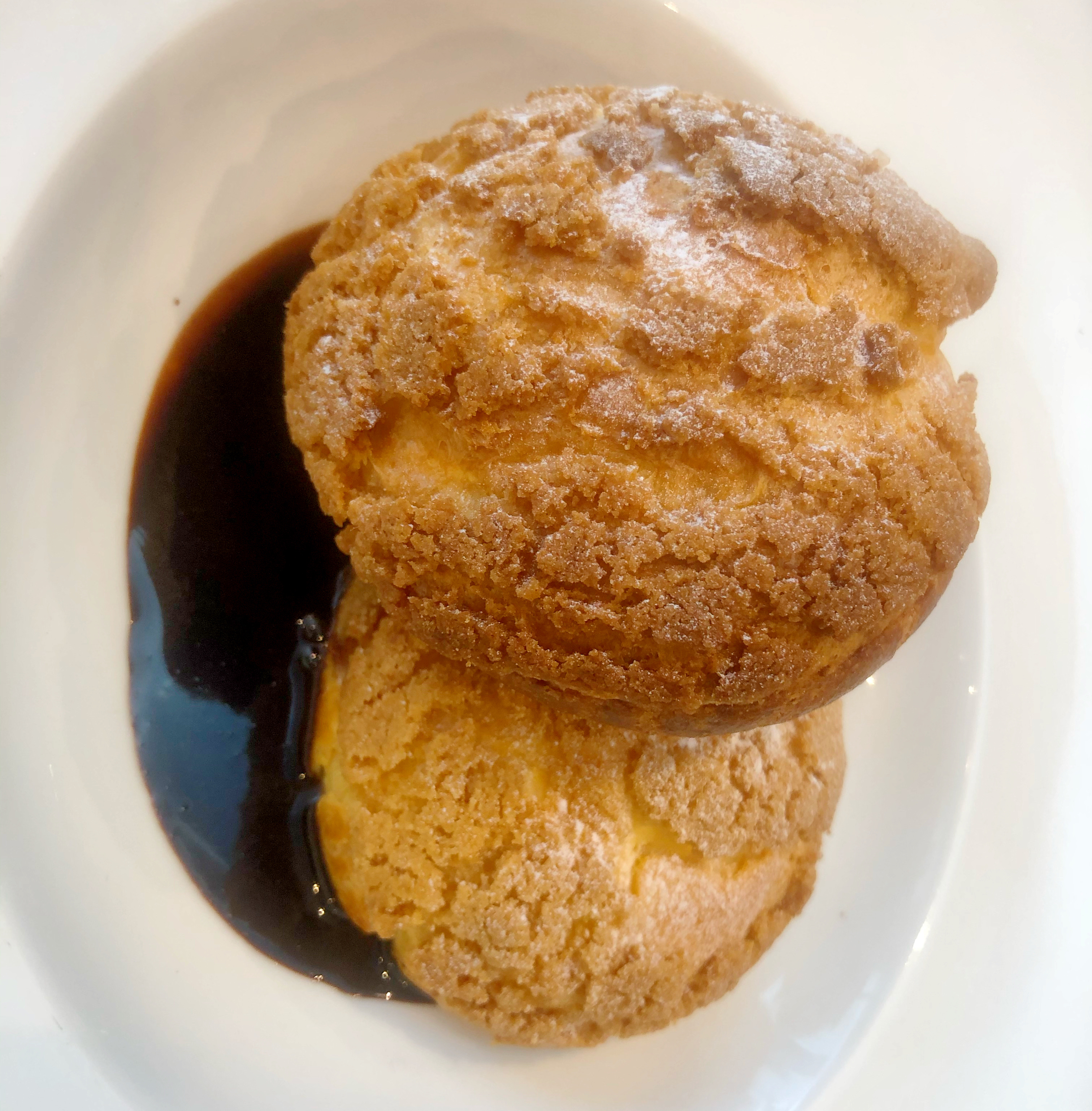India’s look had changed from one that could kill me for enjoying pork crackling, to one of ecstasy as she broke open the extra large profiteroles stuffed full with cream and sitting on a rich chocolate sauce.