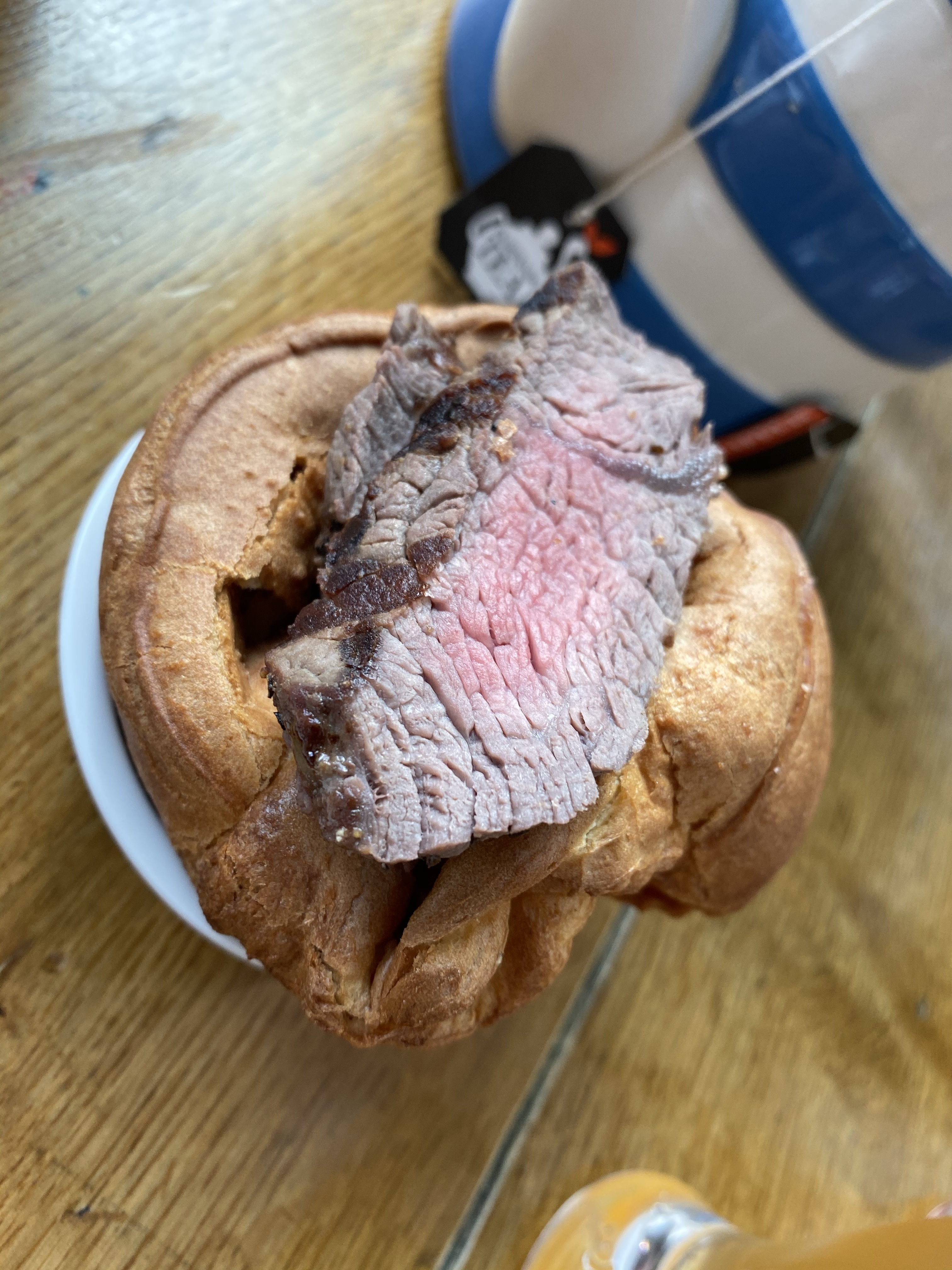 Mini Yorkshire pudding with beef and gravy – again another mini meal. I did look and thing ‘Where’s the gravy’, however all my questions were answered as I cut into it and a thick and tasty gravy oozed out from the centre. The slices of beef on this was also cooked perfectly.