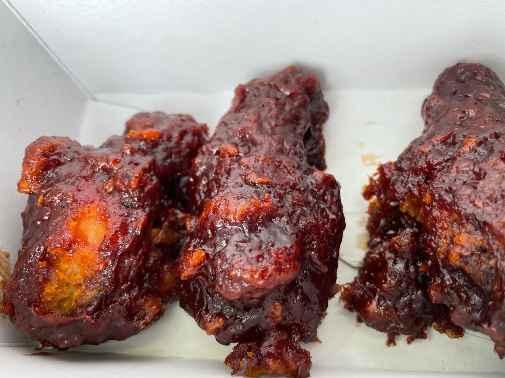The BBQ wings, look just as they should – sticky and messy. I’m surprised to find however, that the wings are the same as the spicy wings, but with the bbq sauce added. Personally I think these would have been better had they been uncoated as the sauce just makes the previously crispy and delicious coating a bit soggy. So not my favorite, but these are the first thing I’ve not been very impressed with.
