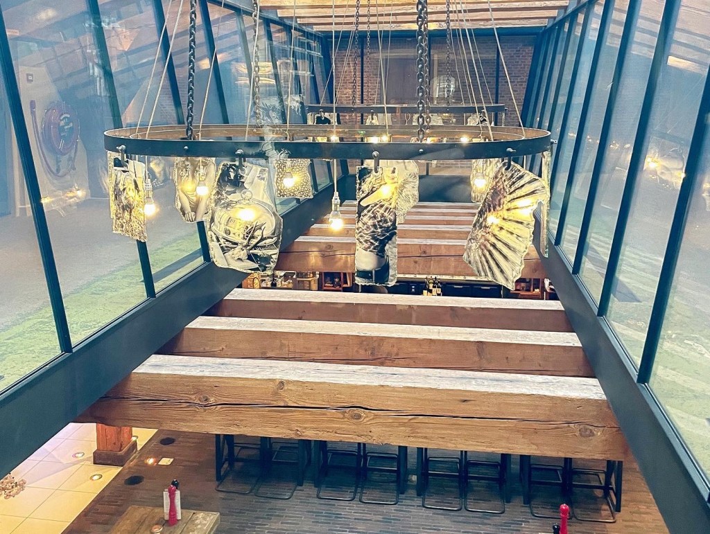 From the 1st floor you can also see large light fittings, made from large butchers hanging racks (Ed was actually a butcher by trade). The racks are also adorned with pieces or glass, featuring local pieces of art.