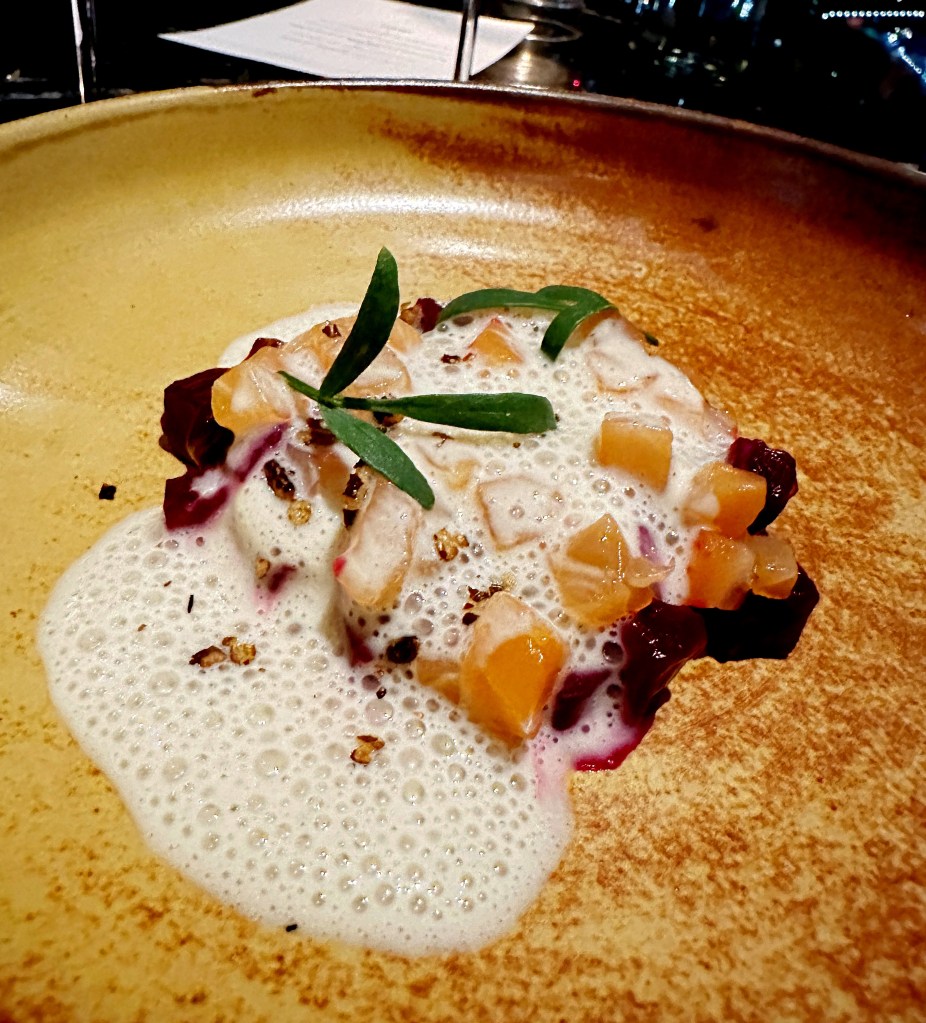 Seared King Oyster Mushroom with Pear and Turnip with a Dashi (A Japanese style stock) was up first. So its here that I have to confess to not being a massive mushroom fan, however as previously said, the point of a taster menu is that it allows you to experience so much, that otherwise you may avoid.