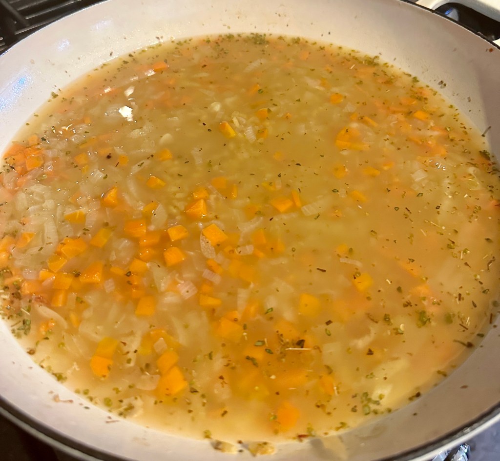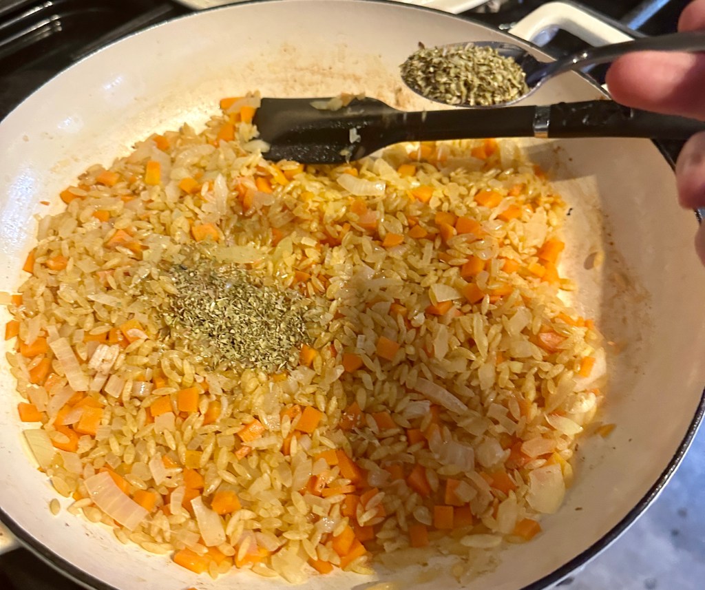 Add the Orzo and slowly mix in while also adding the oregano and thyme.