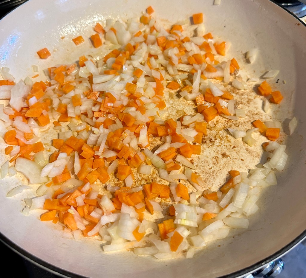 Add the onions and carrots (Finely Diced) to the hot pan and gently fry for 2 mins, before adding the garlic and chorizo and fry for a further minute.
