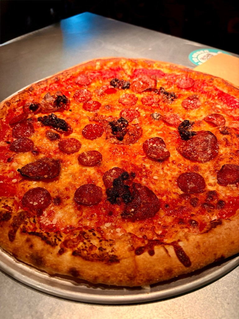 But the real reason to come is, of course, the pizza. The base is exceptional — light, tasty, and full of flavour, with just enough crisp to make each slice satisfying without being heavy. The 22-inch pies are perfect for sharing, but you can also grab individual slices or a 14-inch if you’re not in the mood to take on something huge. The toppings range from familiar favourites to more inventive creations, giving you plenty of choice whether you’re a purist or up for trying something different.