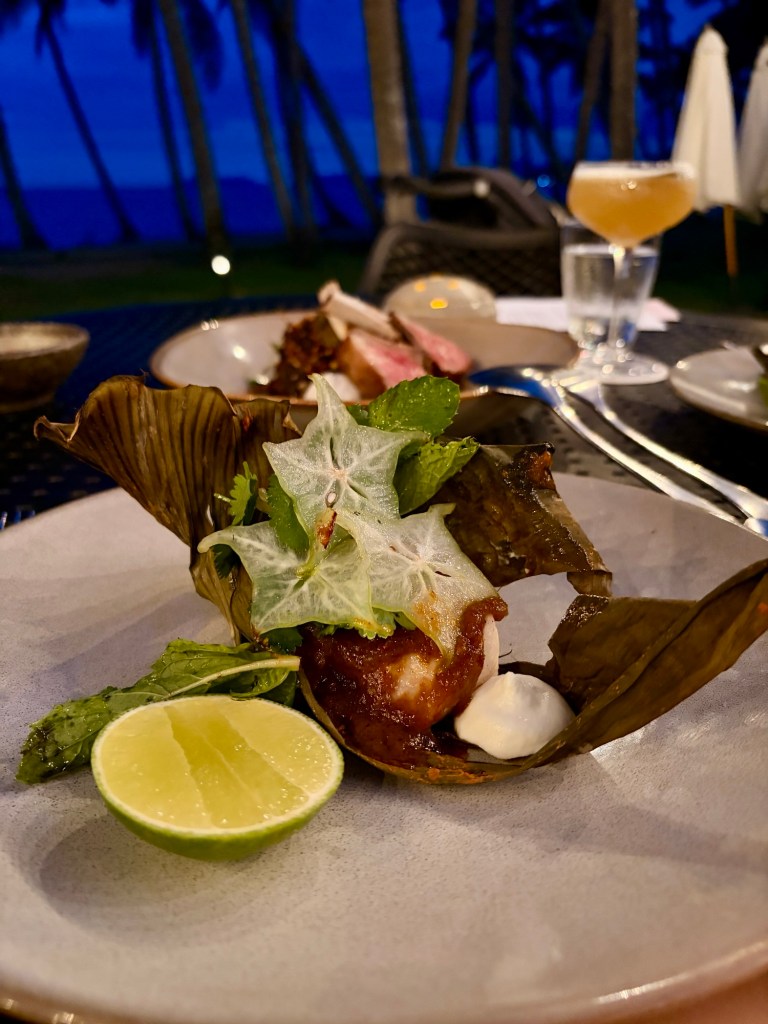 Dessert delivered a bright tropical finale with young coconut, frozen passionfruit curd, monkey butter and hibiscus granita — light, refreshing and not overly sweet.