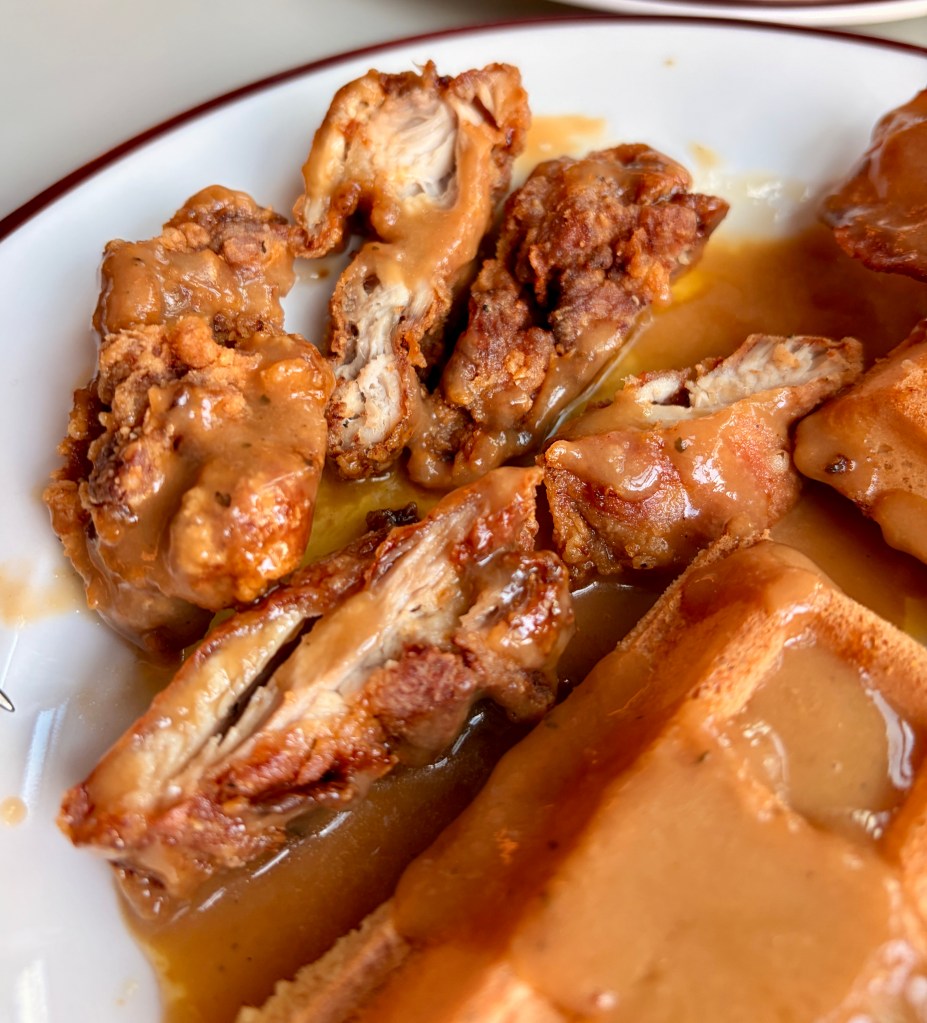 The chicken and waffles arrived well presented, and while the flavours were good — crisp chicken and a light, fluffy waffle —