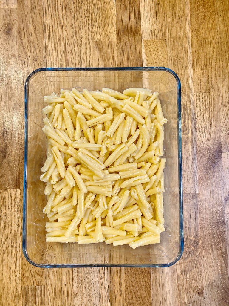 - Layer the pasta base in an ovenproof dish.