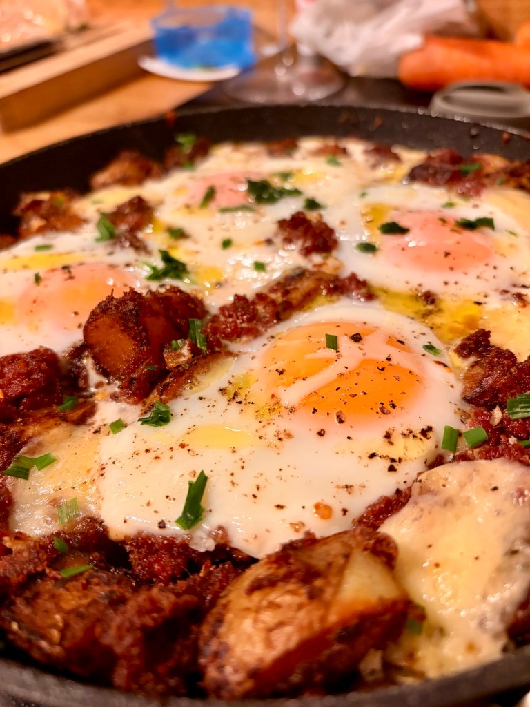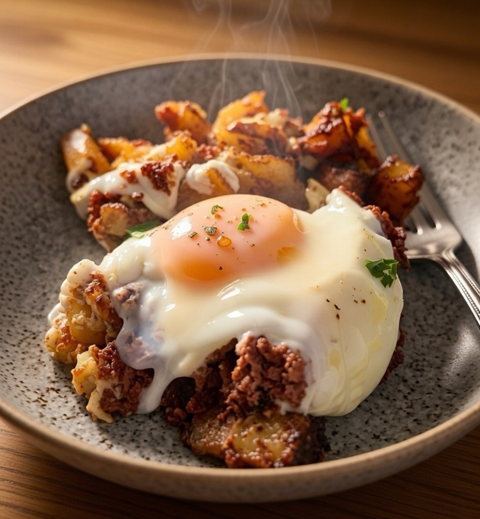 A proper corned beef hash is one of the ultimate comfort foods—crispy golden potatoes, rich savoury flavour, melted cheese, and perfectly baked eggs all in one hearty pan.