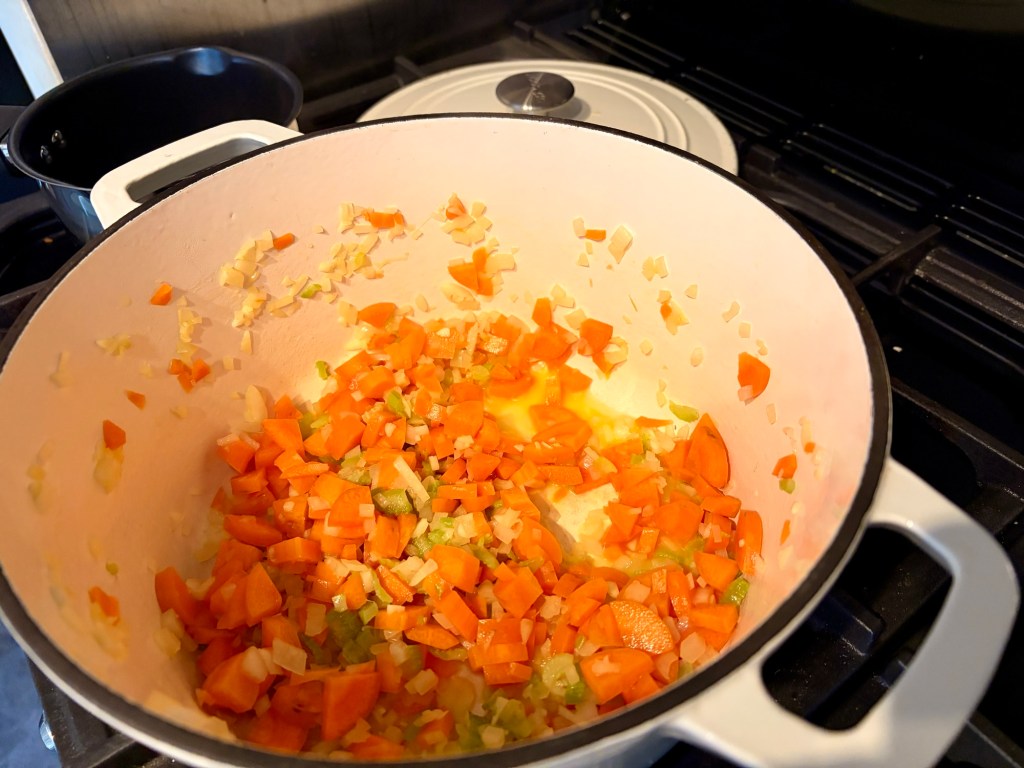 Heat the oil in a large saucepan over a medium heat. Add the onion, carrot and celery with a small pinch of salt and cook gently for 8–10 minutes until softened but not coloured.